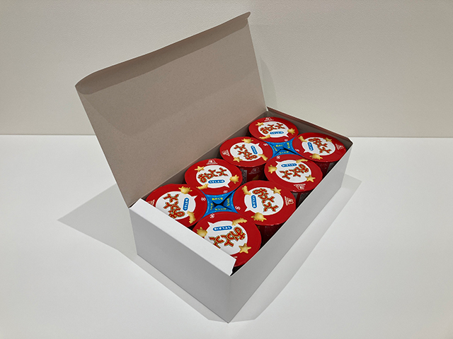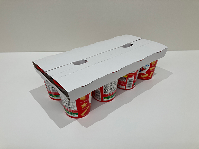 カップ型スナックの輸送時の包装容器に関して、従来品よりも紙の使用量を約60%削減し、かつ、作業性向上も実現した包装容器を、包材メーカーと共同開発し、意匠登録されました(意匠登録第1783788号)。
